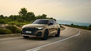 Audi обновила внедорожник Q8, следуя той же теме дизайна, что и электрический Q8 e-tron, с блестящими фарами, аккуратно интегрированными в широкую решетку радиатора.